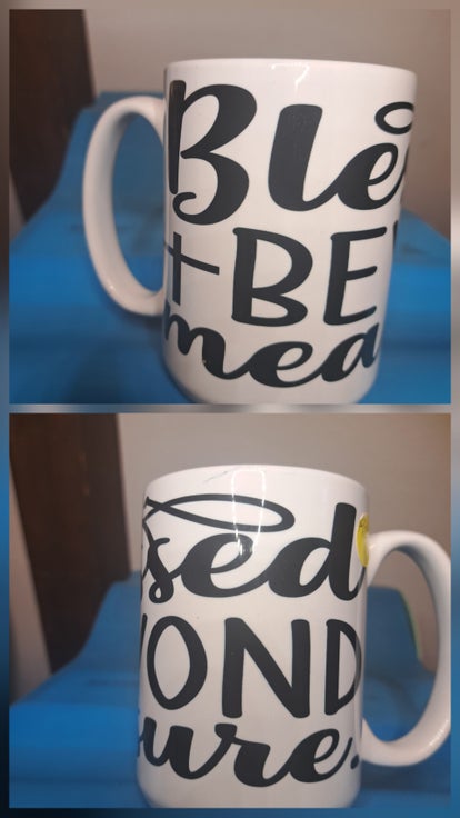 15oz ceramic coffee mug in large writting is Blessed Beyond Measure. Wrapped around