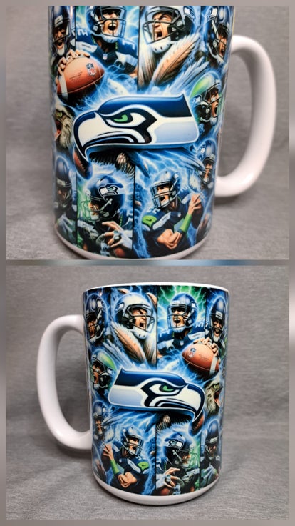 15oz ceramic coffee mug AI created with Seahawk like green face with helmet with wings in the background wit Seattle Seahawks written. The side has Seahawk logo