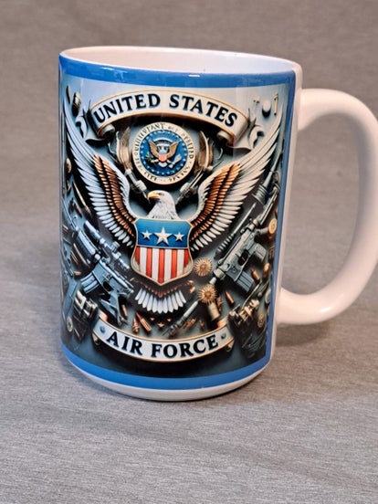 This 15oz ceramic coffee mug has an image of the Air force emblem with an American Eagle, Air Force seal and guns and ammo. with the words United States Air Force