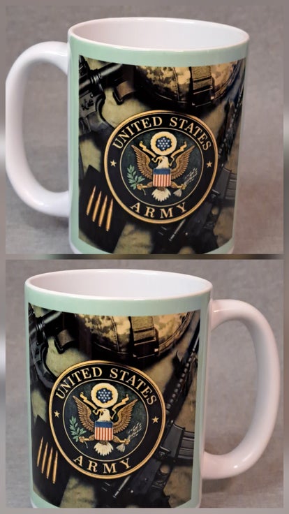 This ceramic 15oz. Mug has a depiction of the US Army emblem with a light green frame. Image same on both sides connected with the frame
