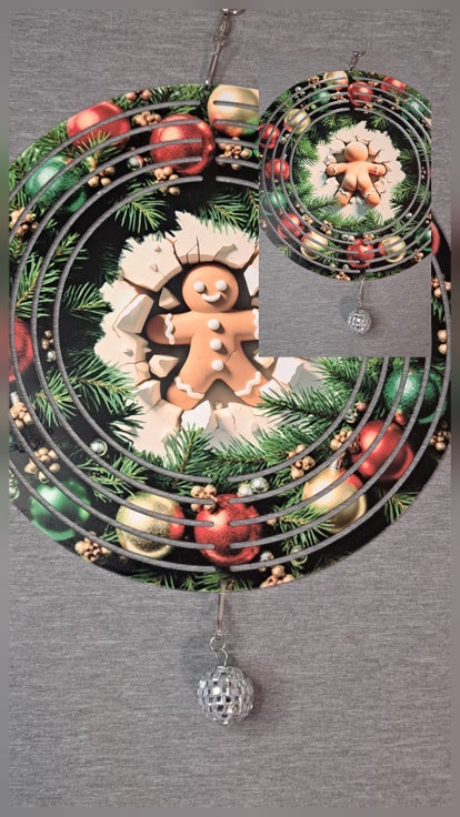 A Christmas wreath with a Gingerbread man tearing through a wall . The back of the spinner is the Gingerbread mans butt going through the wall