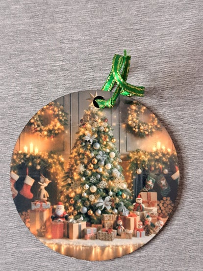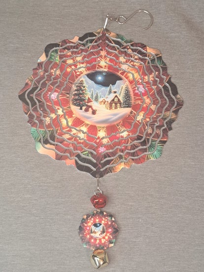 this is a 4inch snowflake shaped spinner with a Christmas tree seen through the center of torn paper. Perfect for a tree ornament