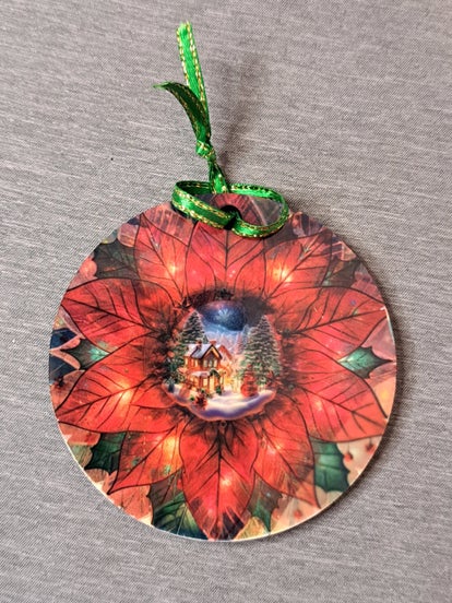 a glass pionsettia with a house in the woods in the center. Same on both sides