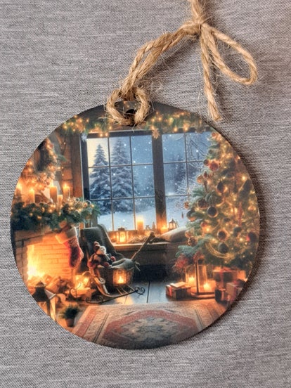a cozy room with a fire and a Christmas tree comfy chair to watch the snow falling outside