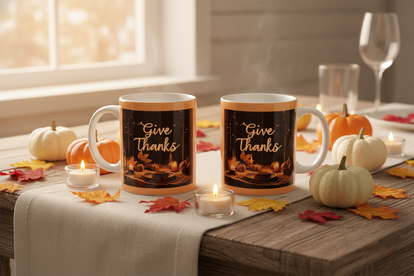 this 12oz set of coffee cups have a low candle lit Thanksgiving table with the words give thanks
