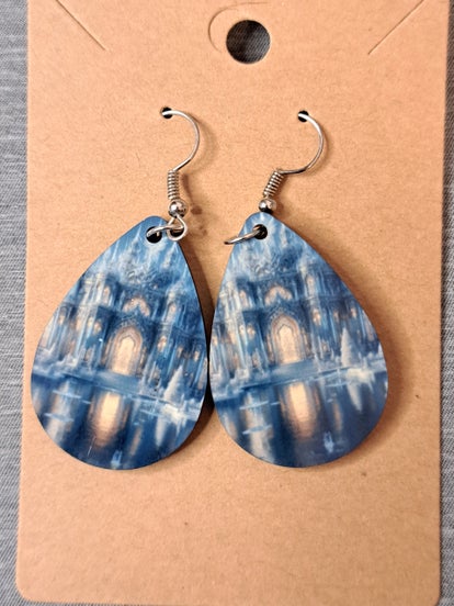 these earrings have cute little momma and bay Penquins in the snow with lights borialas and trees in the background. Same on both sides