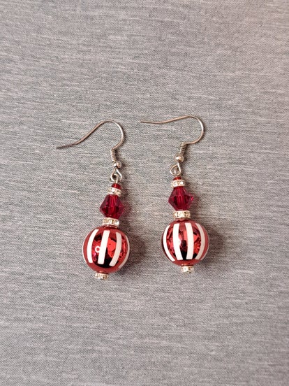 red and white stripped ball with red crystal diamond and 2 rings of faux diamond jewels