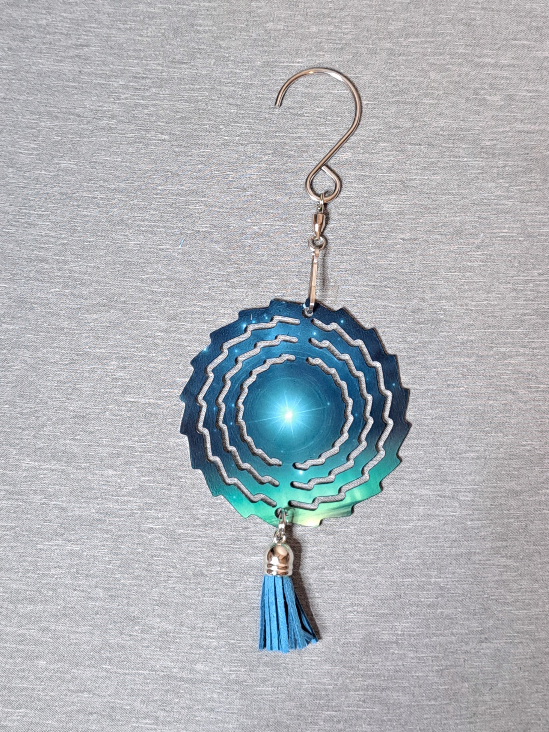 this saw blade shape wind spinner is showing the Northen star with borealis lights