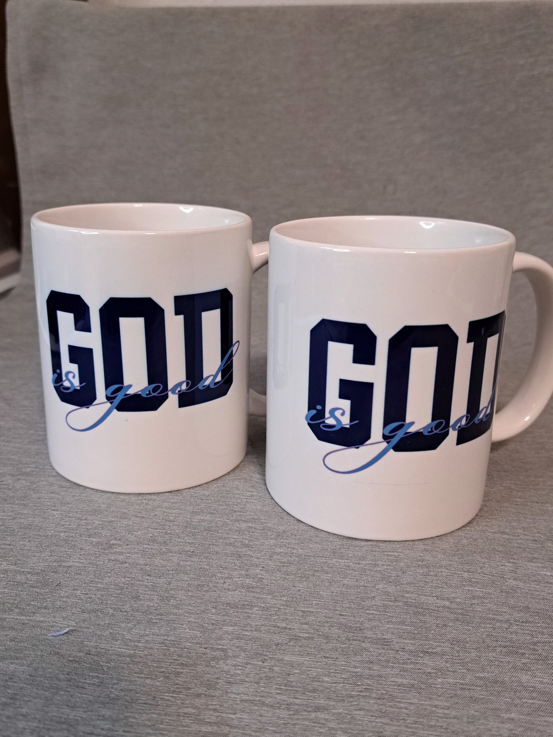 This set of 15oz.ceramic Coffee Mugs with the words God is good. God is written large and is good is written smaller and across the word God. Same image on both sides