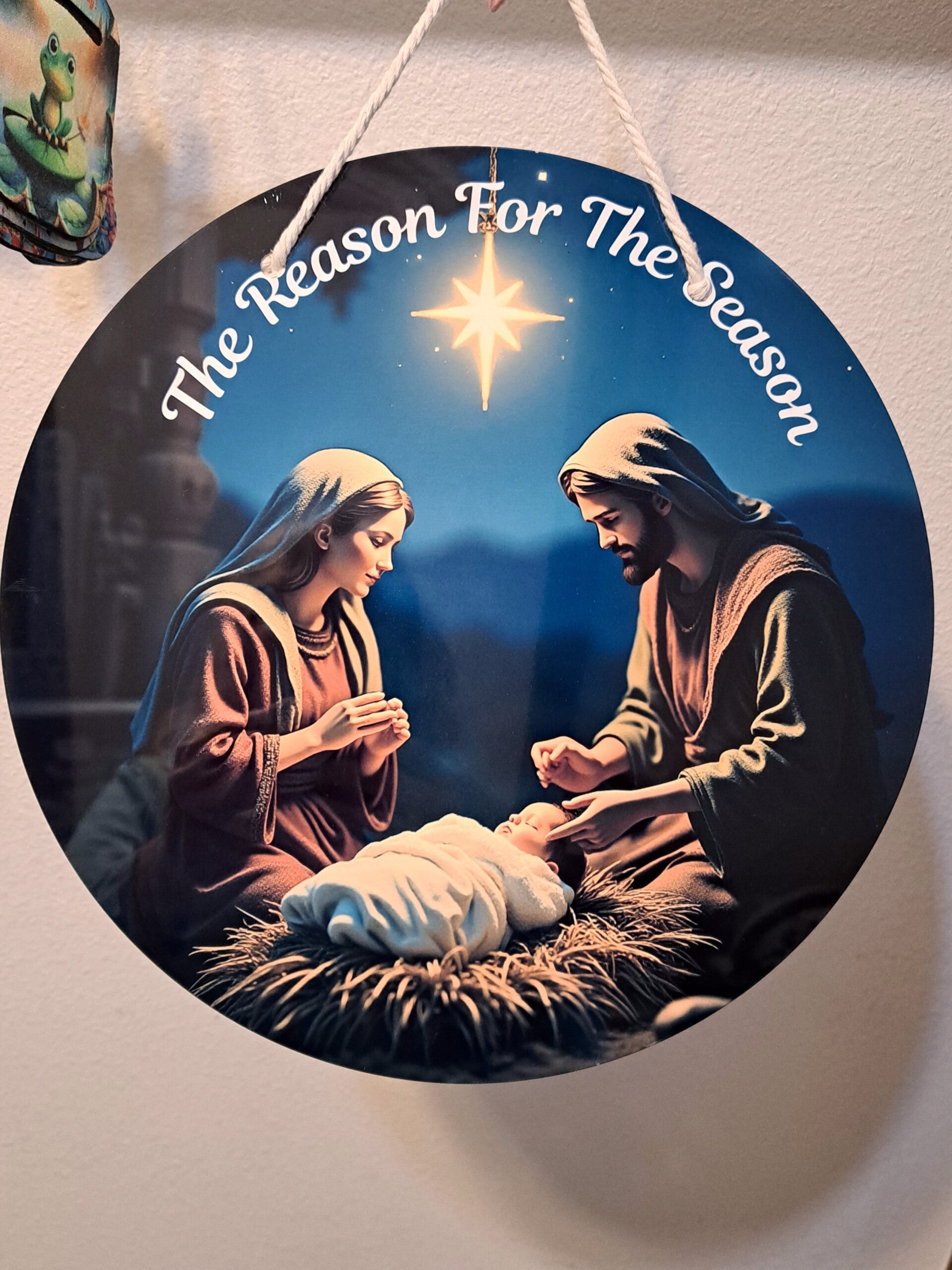 12in round door hanger with a picture of Mary, Joseph and baby Jesus. The words are Reason for the Season