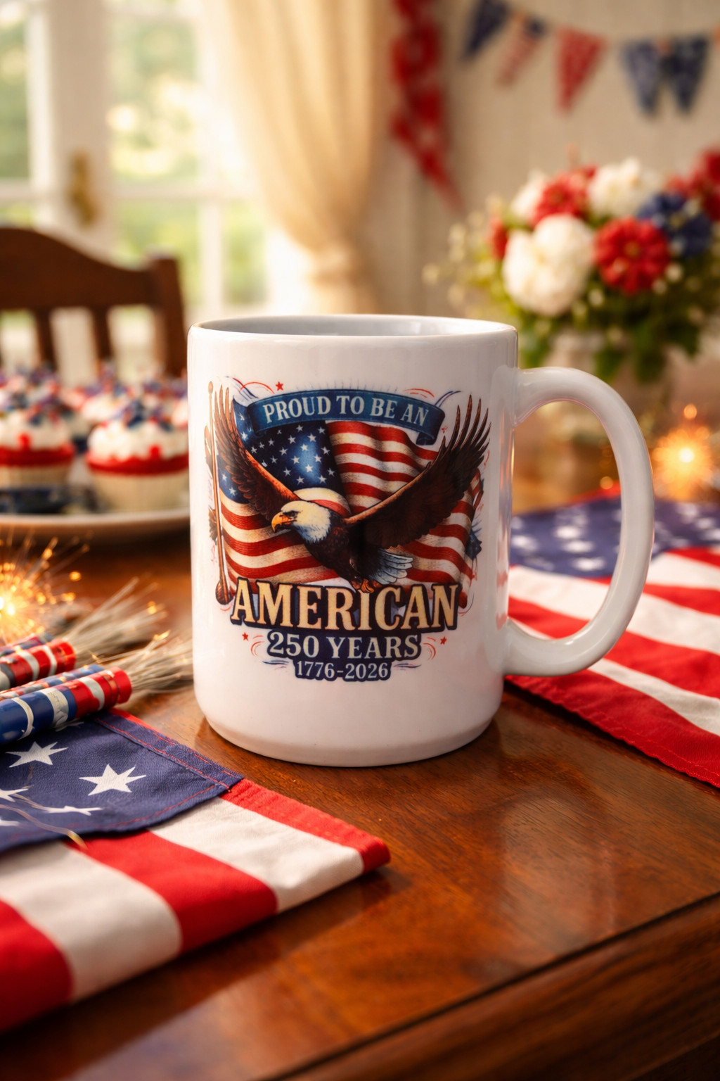 The words Proud to be an American. 250 years 1776-2026 with an American flag and an America Eagle