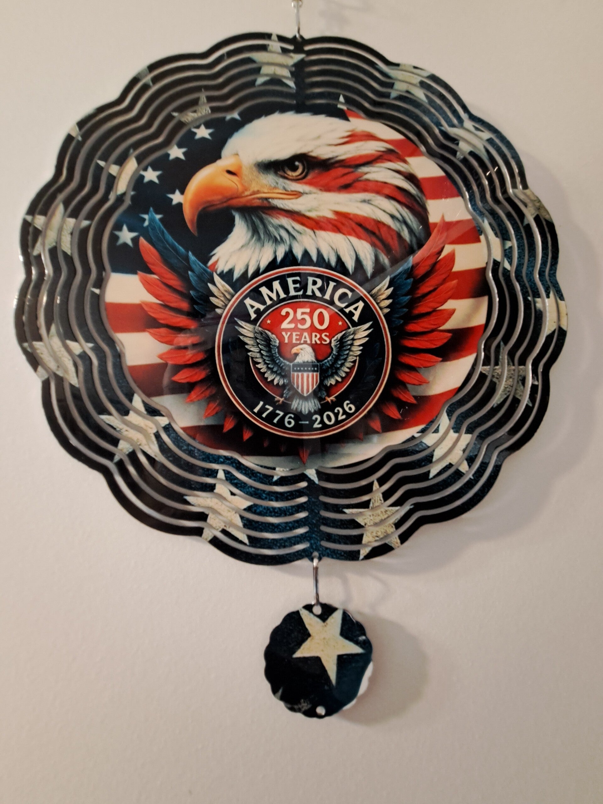 10in wind spinner commerates 250 years of the USA . Bald Eagle in the center with a US emblem with the words AMERICA 250 Years 1776-2026