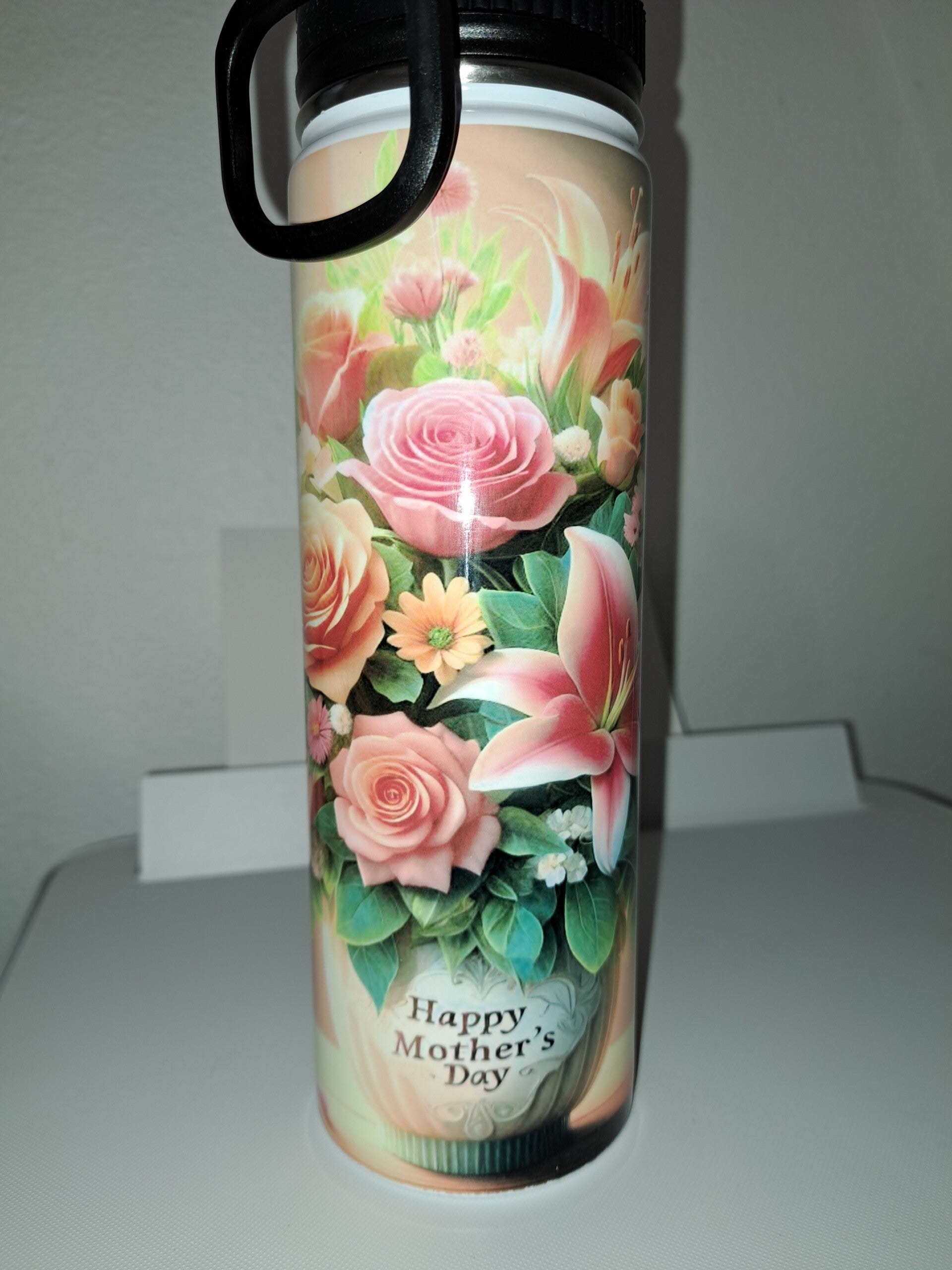 22oz Tumbler with a beautiful vase of flowers and on the vase the words Happy Mother's Day
