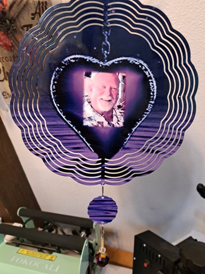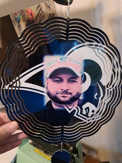 This ten inch wind spinner has someone's son who died suddenly. This photo is the young man and the football team he loved.