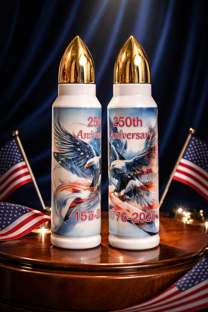 this termos is a silver thermos with guns ammo and an American flag and Bald Eagle