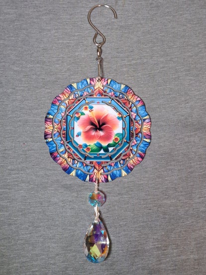 A Hibiscuss in the center of stained glass with irredescent crystal hang from the botom